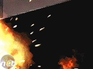 Note how pixellated the explosion on the right is. The wisp of flame in the lower right is substantially less detailed, as the colours simply did not exist when the brightness was later increased. Because we reduced the available colours (dynamic range) before we made changes, the value of the background black has changed substantially: 1,1,1 in the original 24-bit image, it shifted to 7,7,7 in the first image. However, in the second image is blew out to a grey 17,16,16.